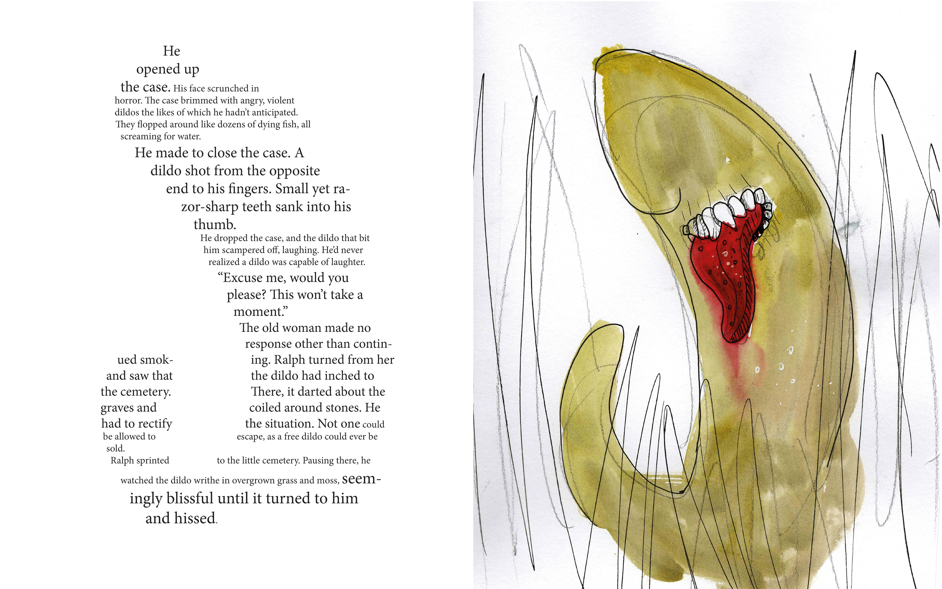The idea for this project was very spontaneous. I accidentally discovered a genre called Bizarro fiction, when one of my friends was laughing on a group chat at the book called The Baby Jesus Butt Plug: Fairy-tale. I was so intrigued by the title, that I went through the rabbit hole and purchased a book full of best bizarro stories. I knew from the start that I will enjoy it and I will illustrate majority of the stories. I was not sure should I choose ants colony in a skeleton, or human dog firefighter, but than I started reading about a travelling dildo salesman and I had an idea. Why illustrate a bit if I can try illustrating whole story? And publish it (non-commercially) to include it in my portfolio?